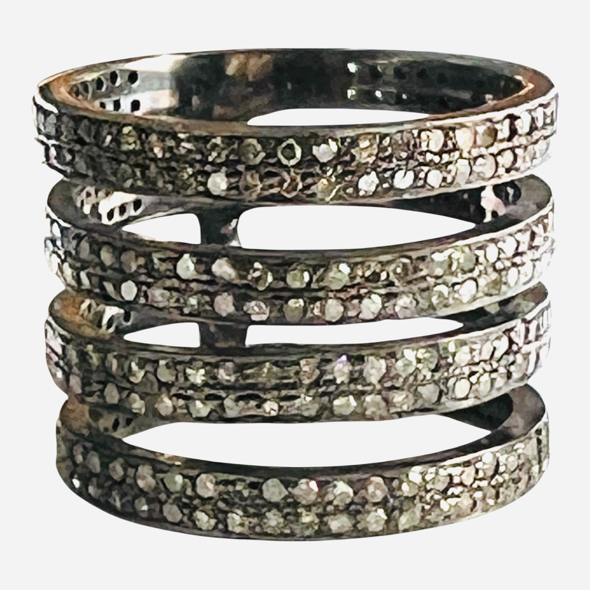 Four rows of sparkling pave diamonds set in sterling silver with rhodium plating (enhanced durability). The ring measures size 7 and looks stunning worn on any finger.