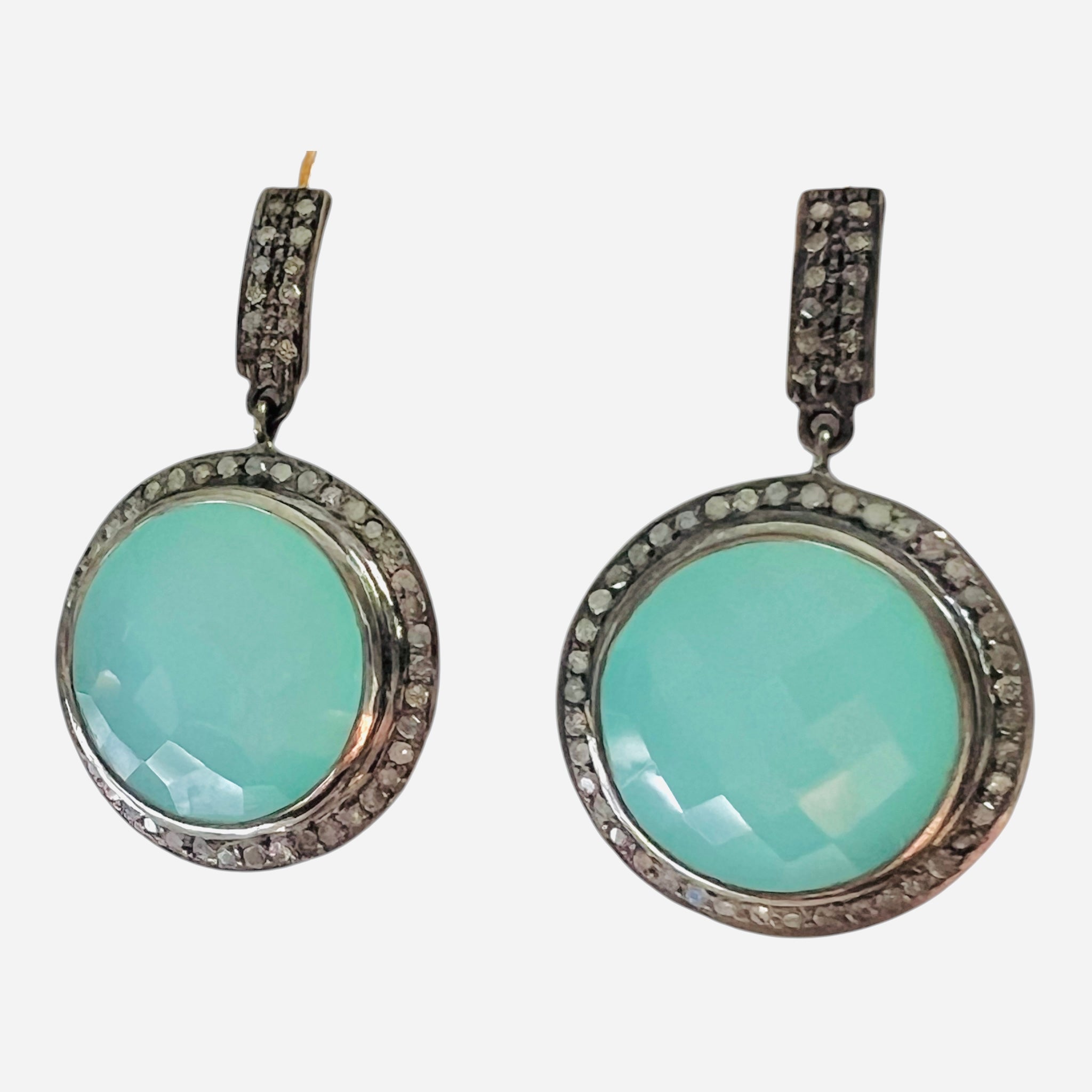 Wow-worthy statement earrings are here! Dramatic and impressive, the Aqua Chalcedony round gems are surrounded by tiny pave diamonds on sterling and suspended from a 1/2" diamond embellished bar with a 14k gold post. The earring sits comfortably on your ear and dangles 1 1/2" long.