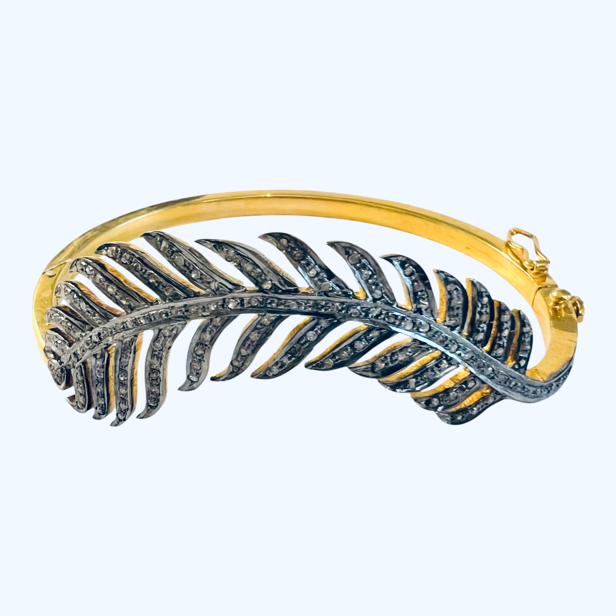 Hinged, Pave Diamond leaf bracelet set in 14k gold over sterling silver.