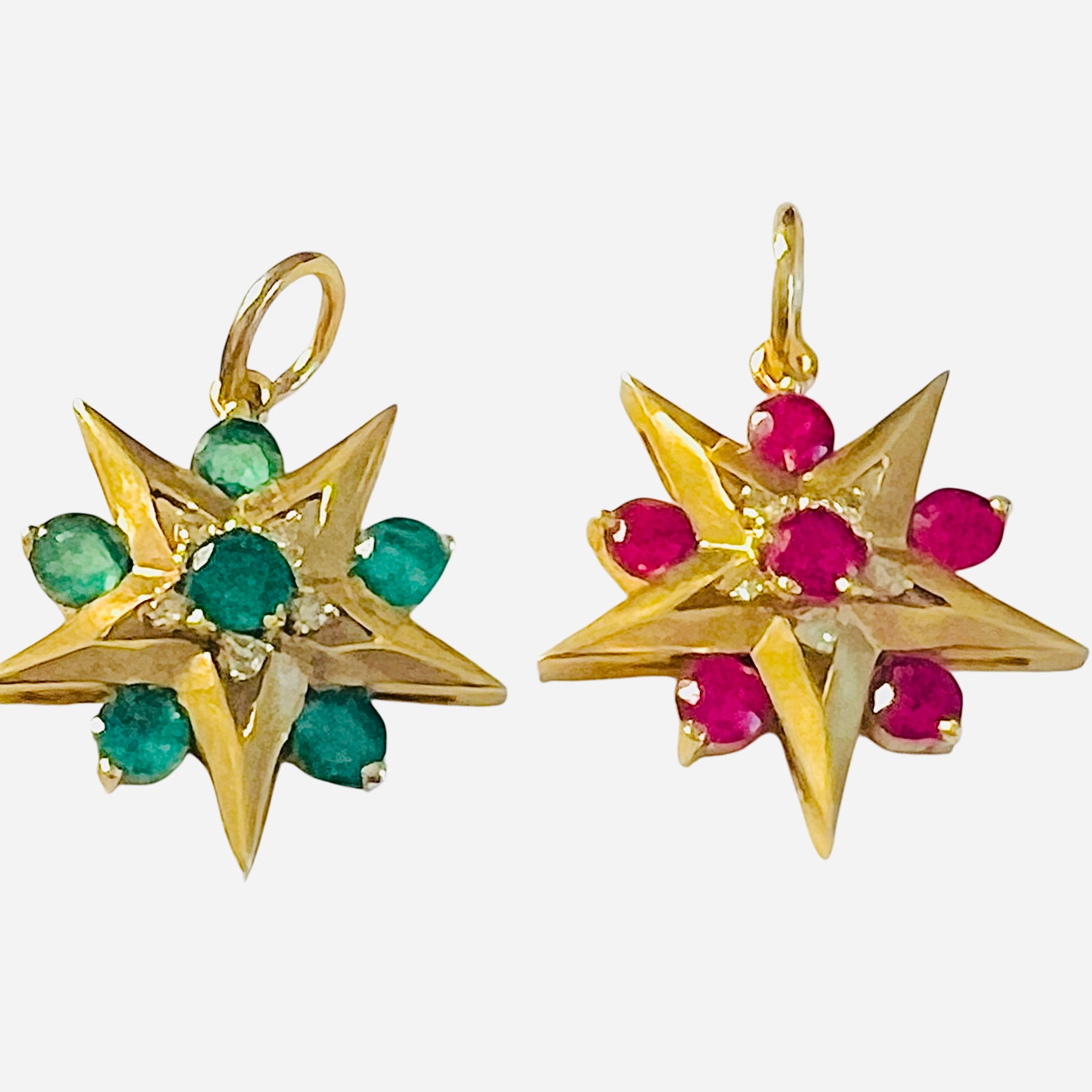 Emeralds or Rubies - you choose! Both are timeless and breathtaking! Six precious gems surround a solid gold star motif, measuring just shy of 1" in width and length. A 14k fill gold chain is also available for purchase (go to 14k gold fill chain in the Holiday 2025 Collection). If you order both, we'll happily ship a complete necklace.