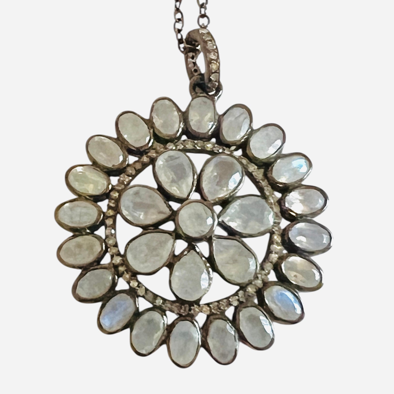 All eyes on this stunning Moonstone and diamond pendant! Photos don't do it justice. Two rows of glowing Moonstones separated by a row of tiny diamonds on rhodium plate sterling. The pendant measures 1 1/4" in diameter. Chain sold separately.