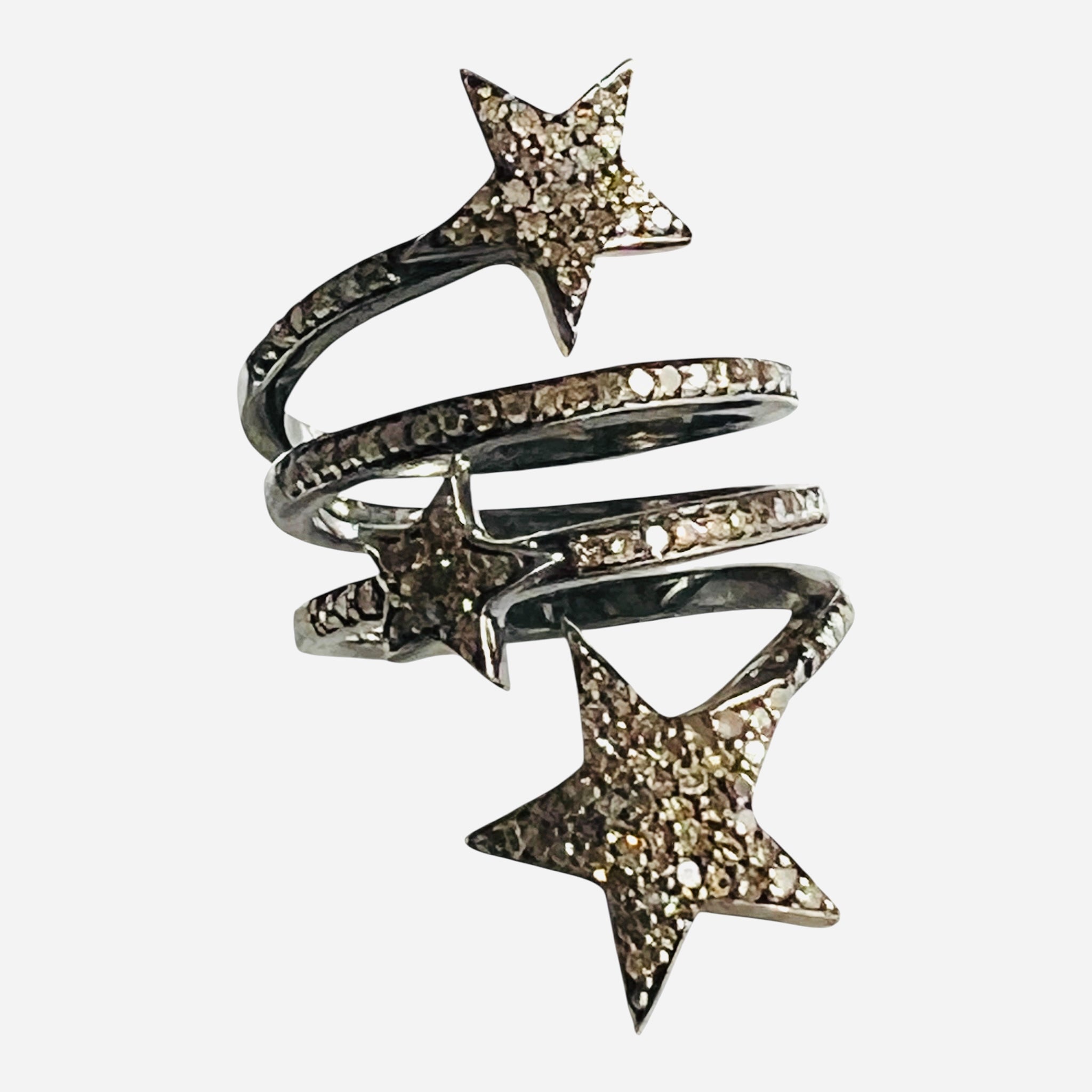 Sparkling pave diamonds stars climb your finger. Set in sterling silver with rhodium plating (enhanced durability), this unique ring measures size 6 and looks stunning worn on any finger.