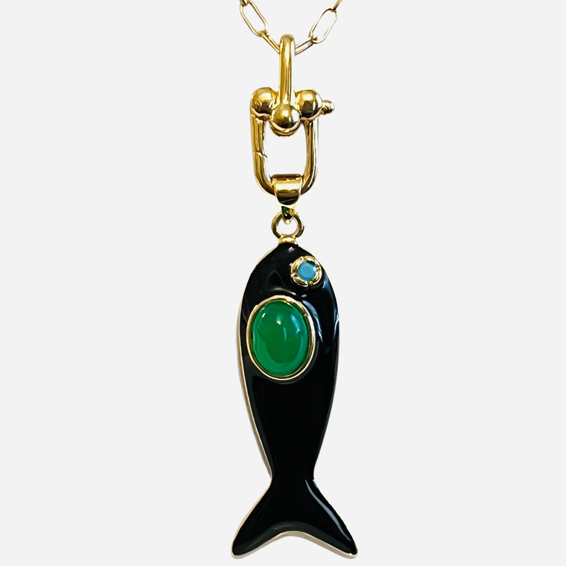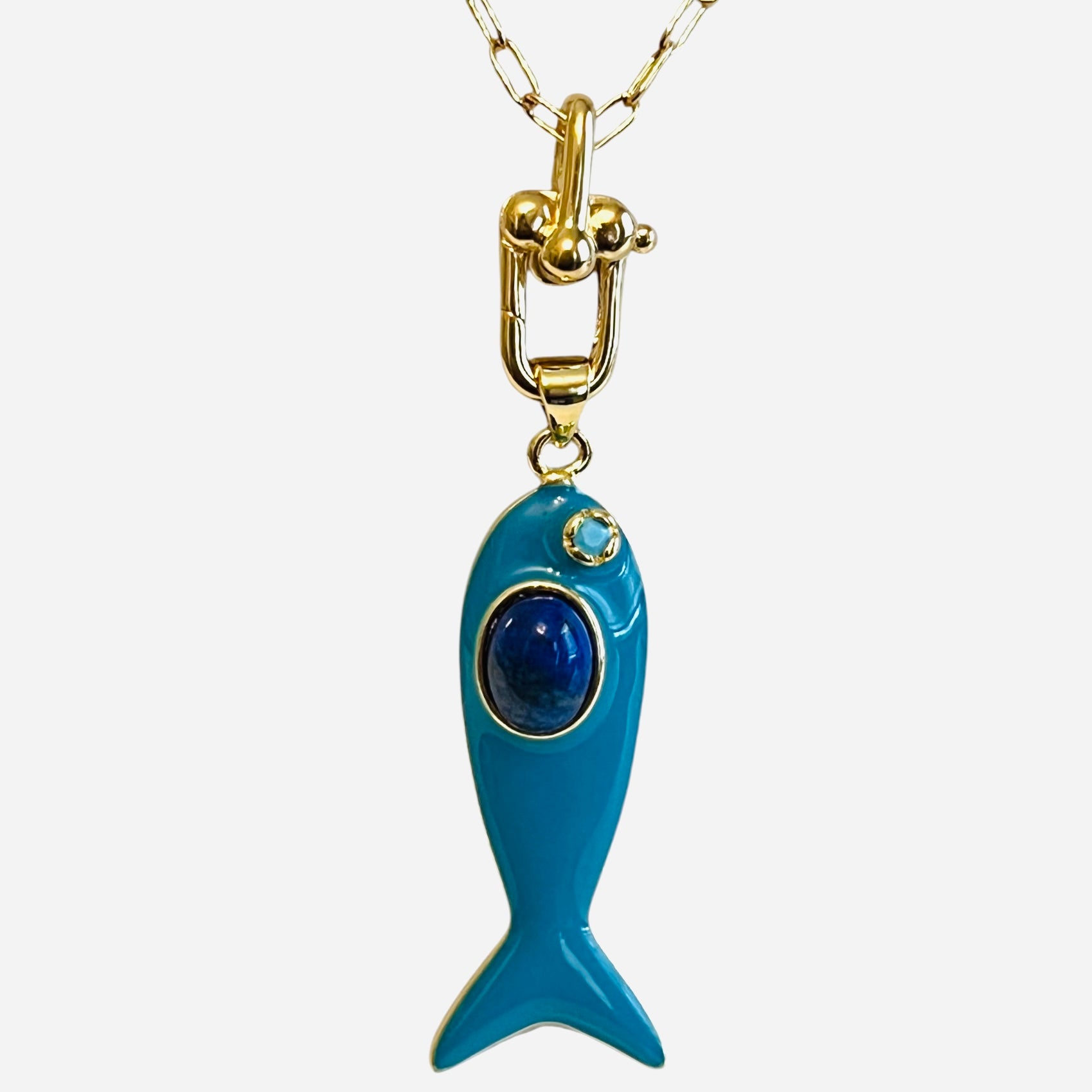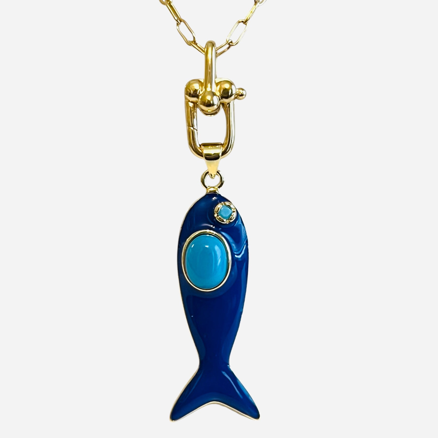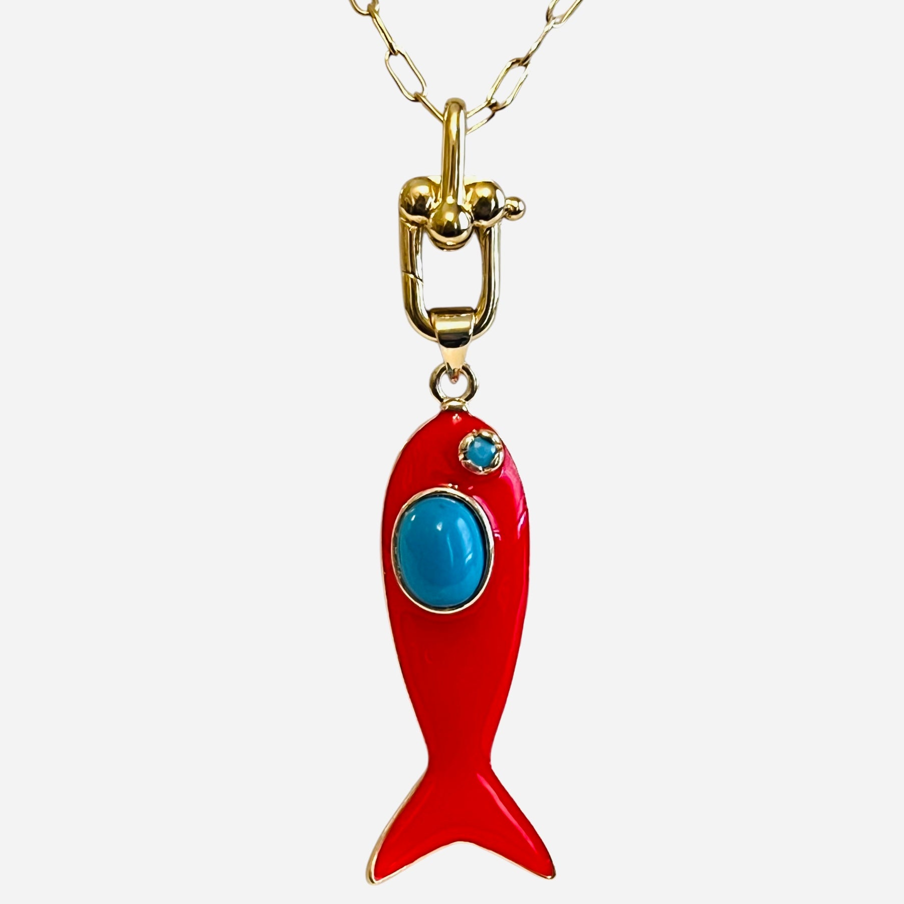 Vibrant and fun, the Go Fish colorful enamel pendant is sure to capture attention! PLUS, you can add, at anytime ,more charms by simply opening the gold carabiner clip. The 14k gold filled paperclip chain is 17" long and held together with a 14k gold filled lobster clasp. We can make the chain any length for you as well as sell the charm separately upon special request.