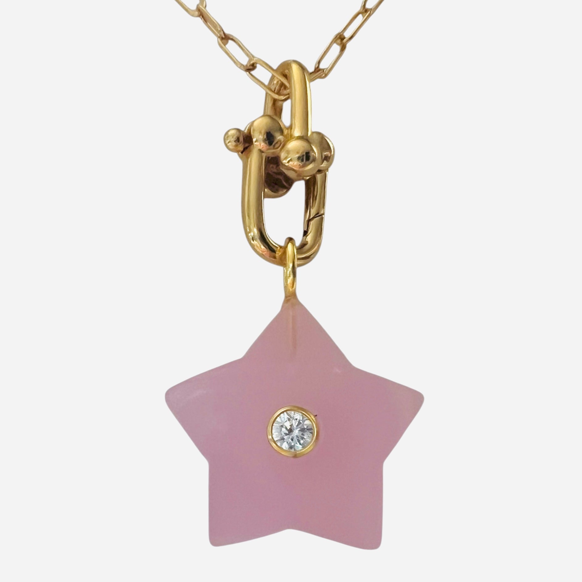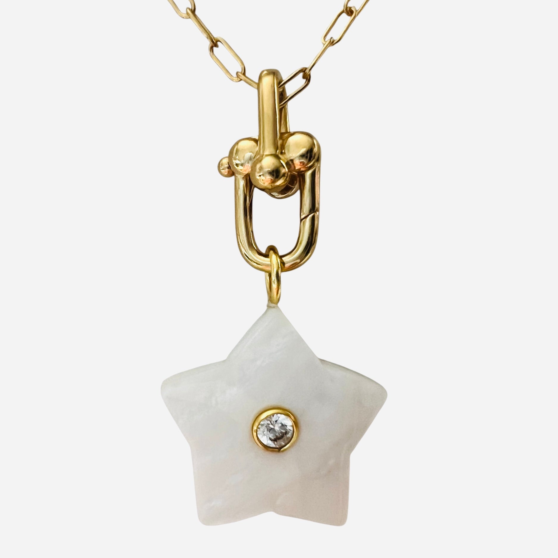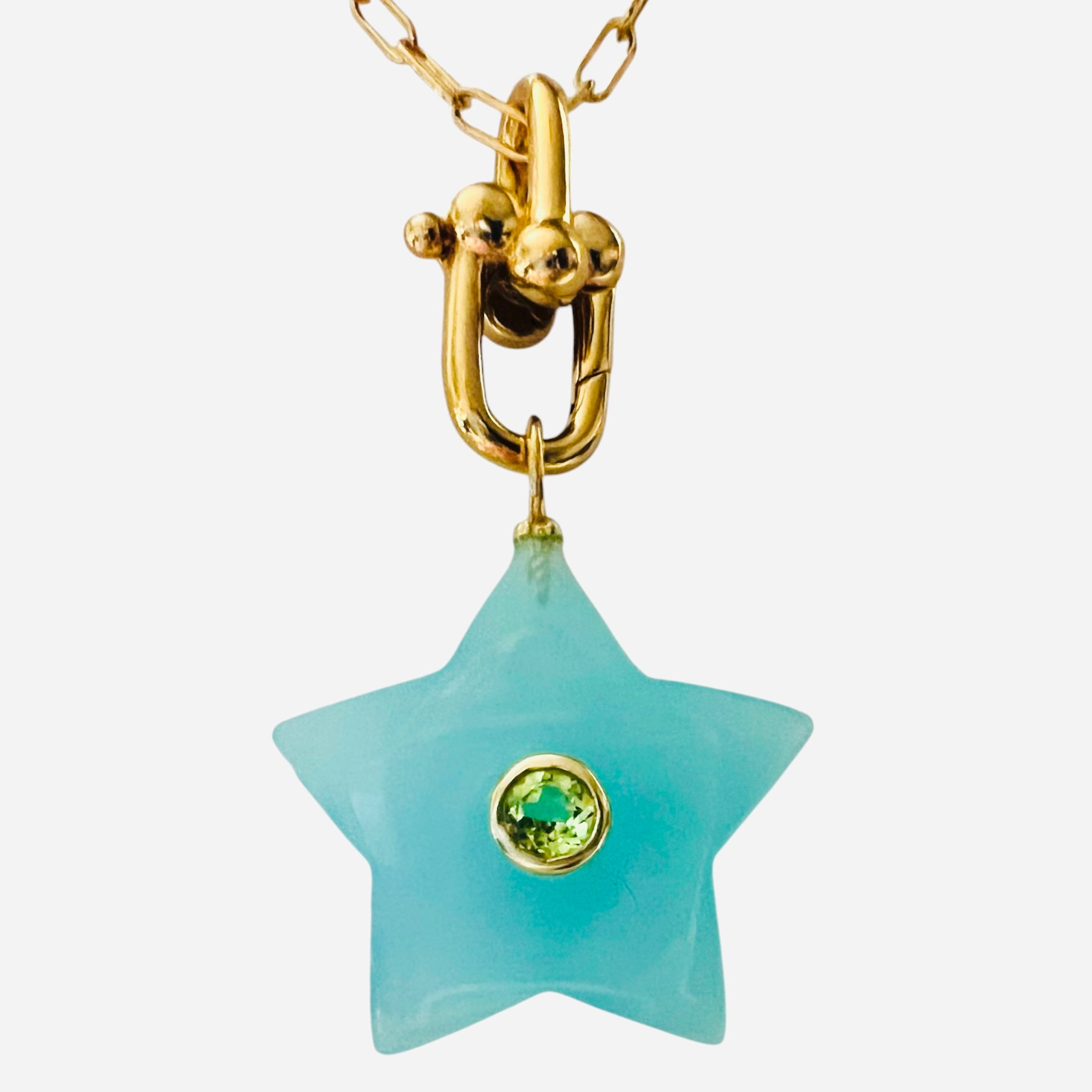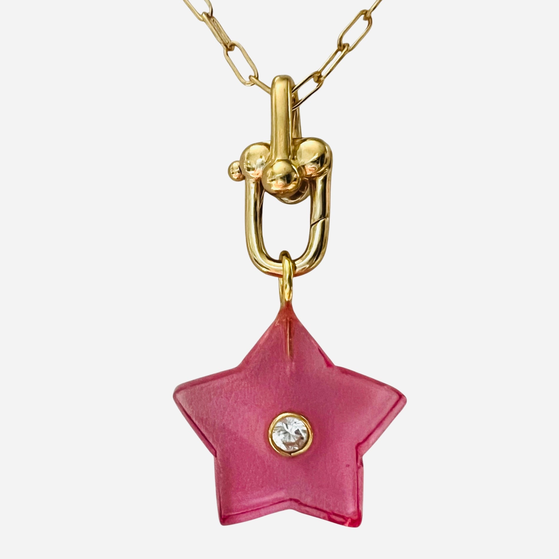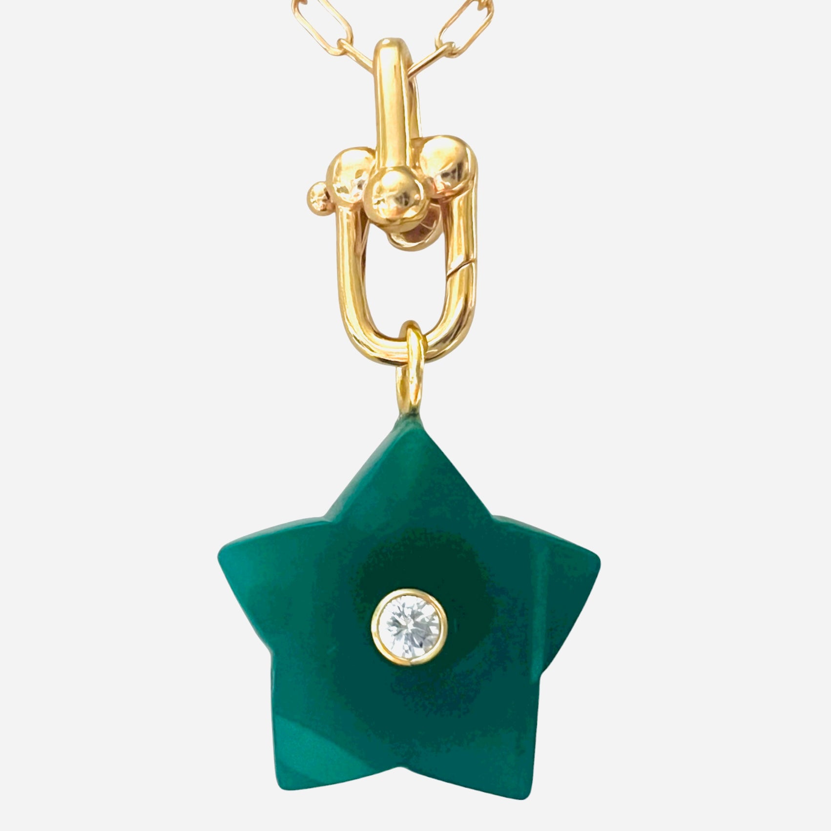Show off your star power with this captivating gemstone pendant necklace! Each one is embellished with a sparkly gemstone center and hangs from a gold caribiner clip (easily opened to add more charms if desired). The gemstone stars are approx. 1" in diameter. The chain is 14k gold fill and 17" in length. Charms can be sold separately upon request.