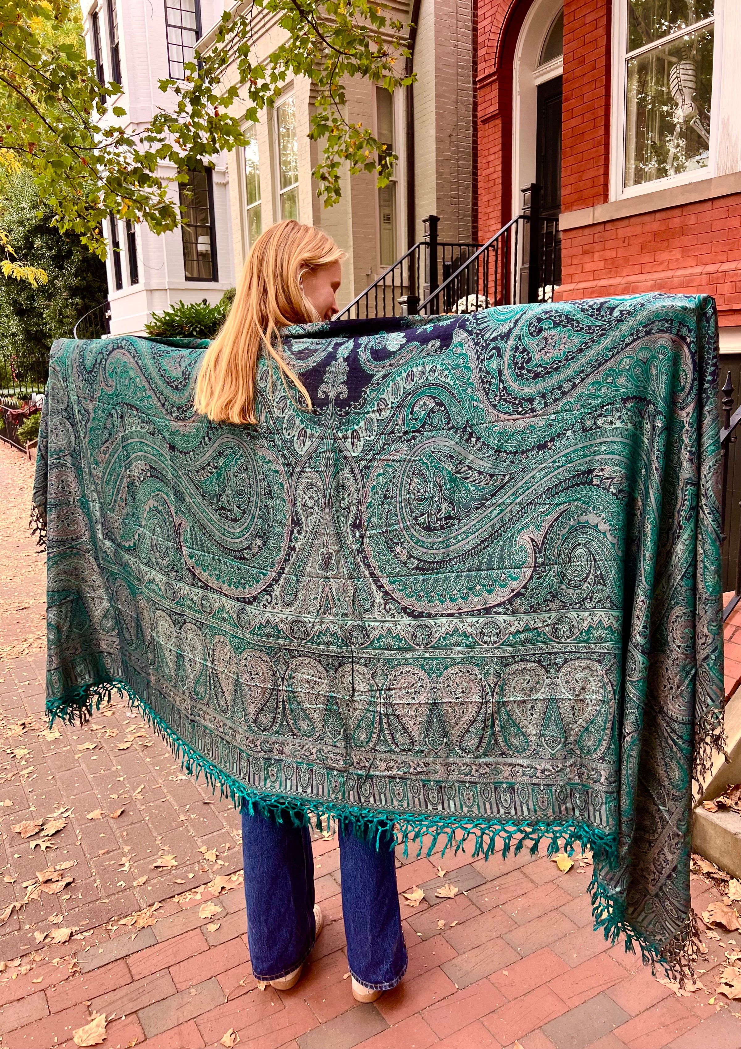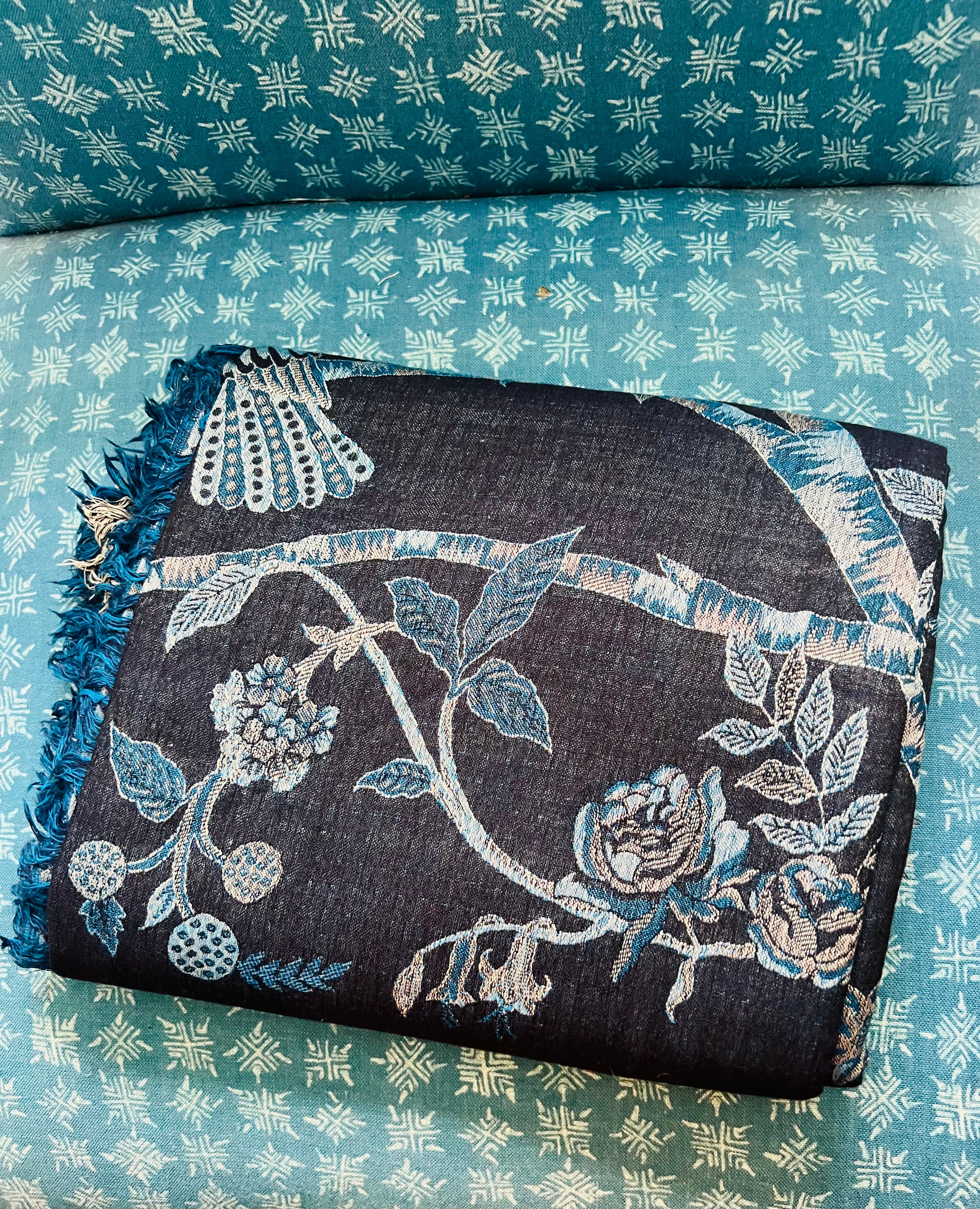 Extra Large Blue Motif Silk/Pashmina Throw (India)