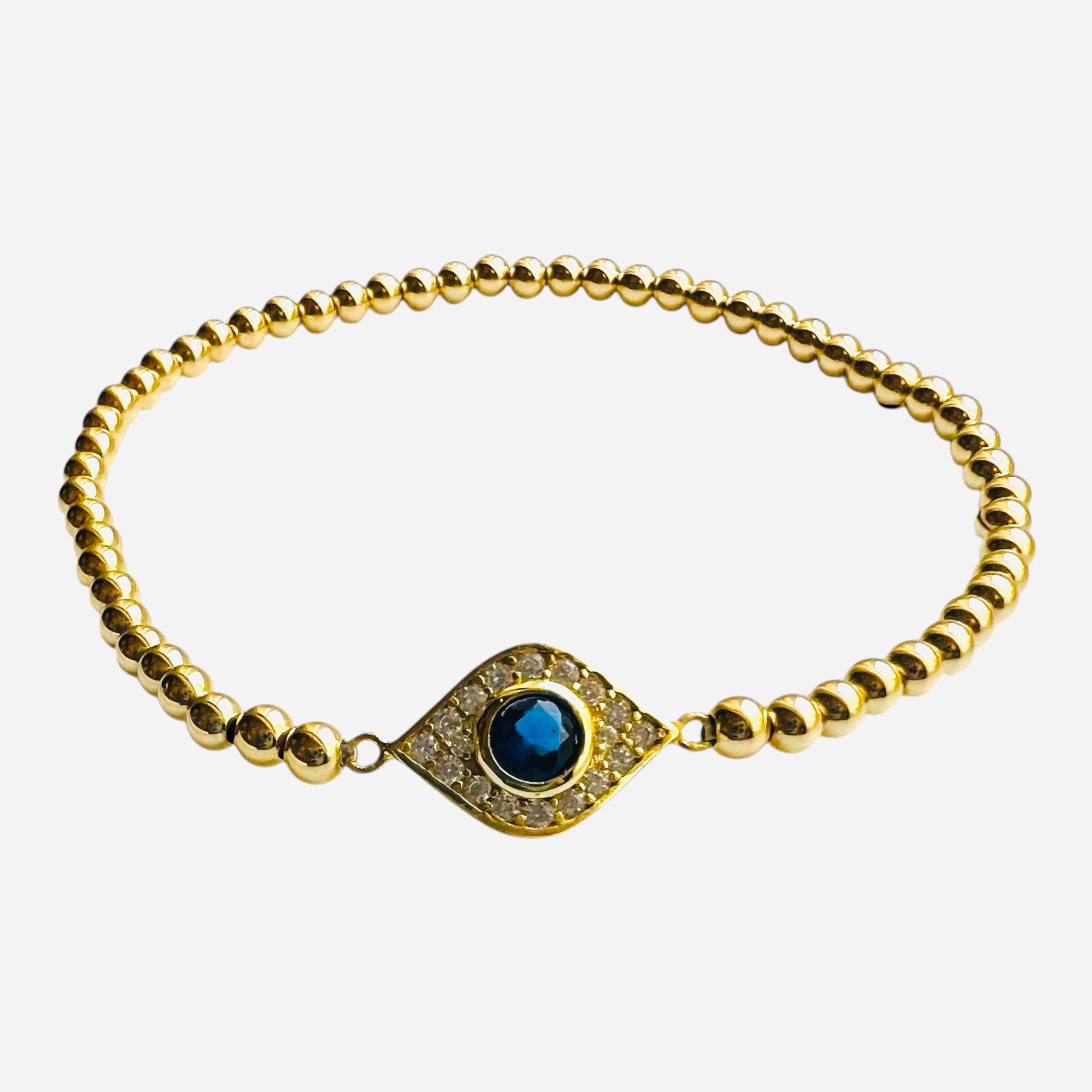 Timeless and offering protection from negative energy, our gold fill evil eye bracelet is a wear everyday! The gold fill 4mm balls won't tarnish and the eye is embellished with tiny crystals. The stretch bracelet will fit most all wrists.