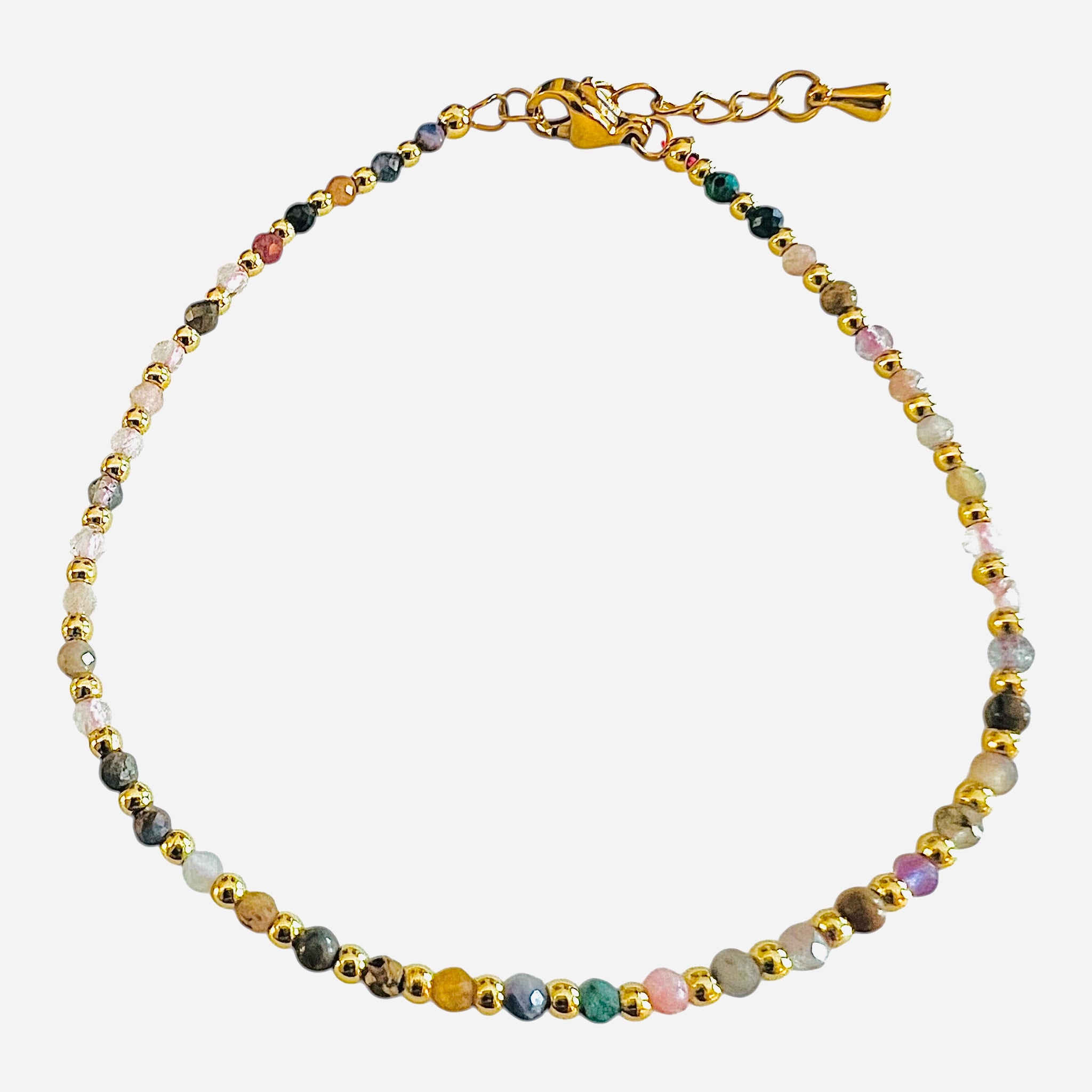 Tiny, colorful, mixed gemstone beaded bracelet accented with tiny gold plate beads. Semi adjustable with an extension chain at the clasp. A great addition to your wrist stack!